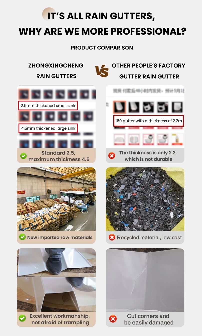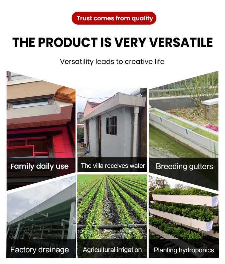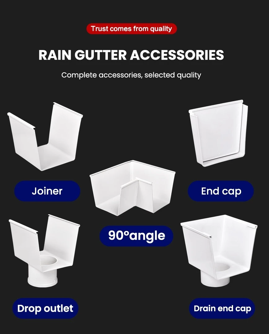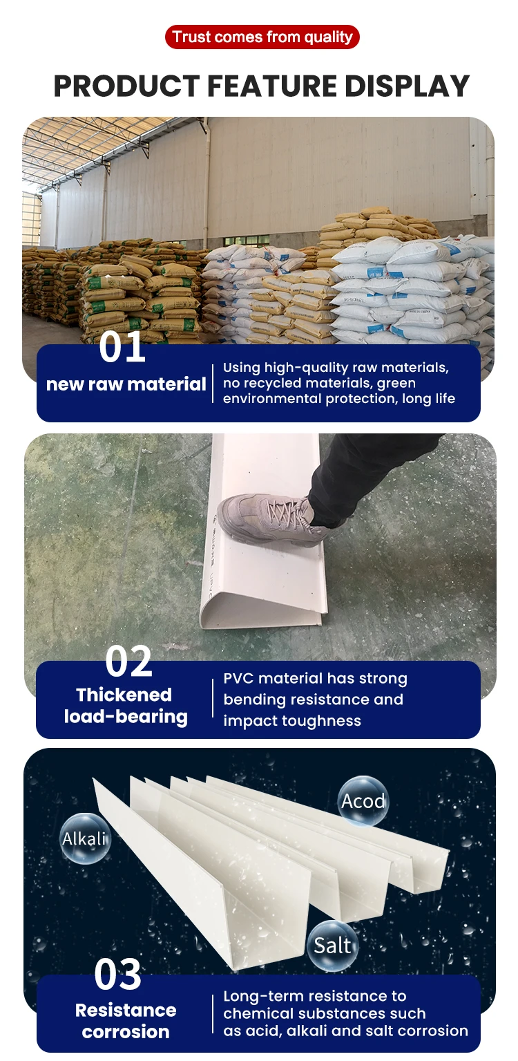 PVC gutter taking place of the metal gutter, anti-acid and alkali-resistant, nice out-looking and durable. Easy installation with high efficiency and low labor cost.
